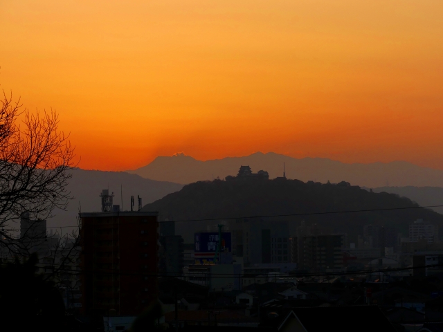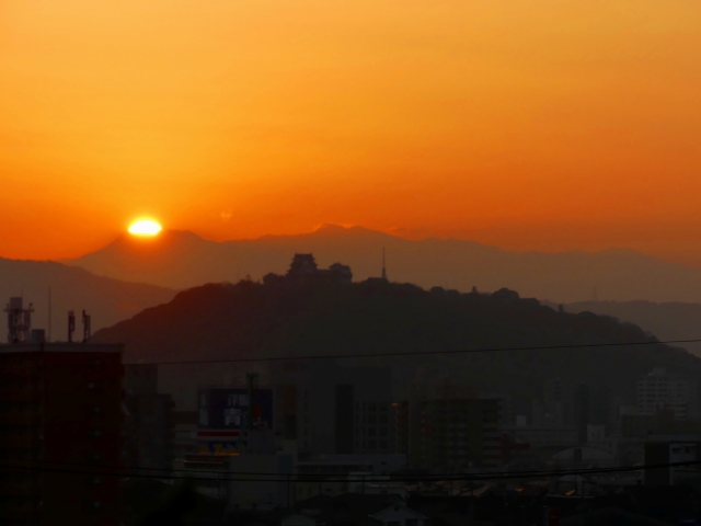 朝焼けの石鎚と松山城のシルエット。いよいよ始まります。